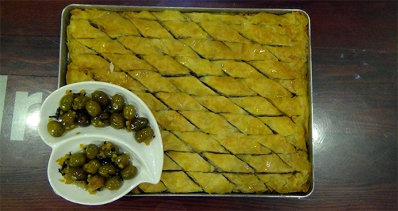 Edremit ilçesinde zeytin ve zeytinyağı satış ve üretimi yapan bir firma Ramazan Bayramı'nda gelen müşterilerine ikram etmek için zeytinli baklava üretti. Görünüş olarak normal baklavalara benzeyen zeytinli baklava iç malzemesi ile farklılık oluşturuyor. Zeytin reçeli için üretilen tatlandırılmış zeytinlerden iç malzemesi olan baklava büyük ilgi görüyor.