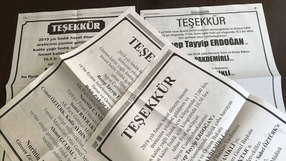 Giresun Ziraat Odası, 2019 ürünü Giresun kalite fındığa 17 lira taban fiyatı açıklamasından dolayı Cumhurbaşkanı Recep Erdoğan'a teşekkür için yerel gazetelere ilan verdi.