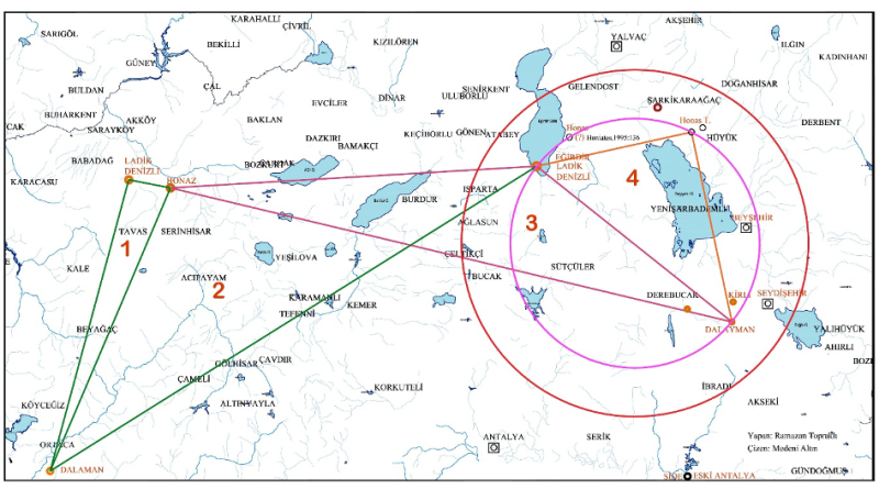 Har. 1: 1261’de kurulan Menteşe/Denizli Beyliği’nin sınırlarını gösterir harita. Tarihçi, beylik sınırı için 1 numaralı bölge dedi. Eğirdir’in Lâdik olduğunu fark edince 2 numaralı bölgenin daha doğru olabileceğini düşündüm. Ancak Mehmet Beye tâbi Türkmenlerin, Hoca Mecdeddin’e ait kervanı, Antalya [Side] ile Konya arasındaki yolda soymaları ve İzzeddin’in ordusunu Antalya-Alâiye arasında yenmiş olmaları, beni, yeni bir Dalaman aramaya sevk etti ve Talamani’nin Derebucak-Dalayman [Çamlık] olduğunu gördüm ve 3 numaralı bölge ihtimali belirdi. Gelendost ile Eğirdir arası (Khoniates, 1995: 136) ve Konya-Hüyük-Göçeri köyü olmak üzere iki Honas daha vardı ve fermanda geçen Honas, Göçeri-Honas; “beylik” sınırı ise 4 numaralı bölge olmalıydı. “Talmanya ovası, Pamfilya Side’sinde ve Borlu -Alanya yolu üzerindedir” (Honigmann, 1939: 686). Filhakika Dalayman, hem Pamfilya Side’si, hem de Borlu [Uluborlu]-Alanya yolu üzerindedir.