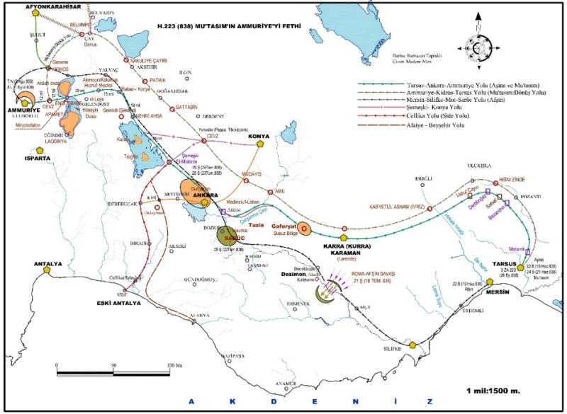 Har.2: Değişen coğrafya, Halife el-Mu’tasım’ın 838 yılındaki Ammûriye [Amorion] seferinde kullandığı yol ve diğer tarihî yollar.