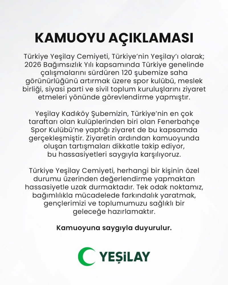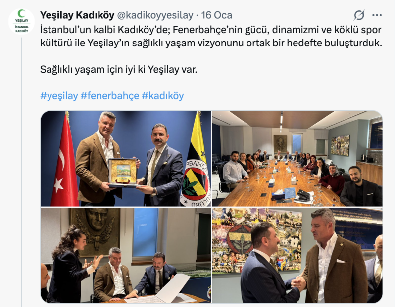 Yeşilay Kadıköy şubesi, yönetim kurulu üyeleriyle yaptığı ziyaret fotoğraflarını paylaştı ve şu notu düştü: “İstanbul’un kalbi Kadıköy’de; Fenerbahçe’nin gücü, dinamizmi ve köklü spor kültürü ile Yeşilay’ın sağlıklı yaşam vizyonunu ortak bir hedefte buluşturduk. Sağlıklı yaşam için iyi ki Yeşilay var. #yeşilay #fenerbahçe #kadıköy.”