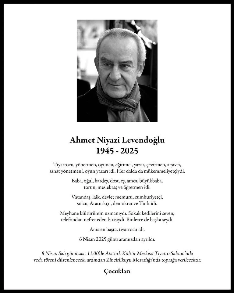 Geçtiğimiz gün hayatını kaybeden tiyatro sanatçısı Ahmet Levendoğlu'nun ailesi, sanaçının vasiyetini yerine getirdi!..
