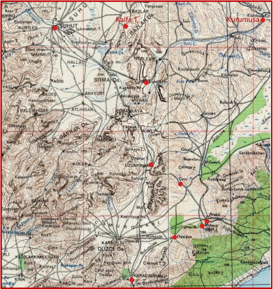 <div><span><strong>Har.1:</strong> Şuhut, 1247 <strong>Kalfa T</strong>., <strong>Bazlar</strong>, <strong>Kurumusa Kp</strong>., Karahallı, Uzunpınar, Çoru, Oyniğan, Kılıçkaya [Muhacir], Arızlı [Gereme]. Ayrıca Yoğurtçubeli ve Bozdurmuşbeli adlı tarihî iki dağ geçidine [beline] dikkat. Yoğurtçubeli, İbn Hordazbih’te [847], Bozdurmuşbeli ise hem İbn Hordazbih [847], hem el-İdrîsî [1153], hem Peutinger Tablosu, hem Antonine İtineneri, hem de Kudüs İtineneri’nde verilir. Yoğurtçubeli, 438 Nu. MVAD I.’de Uluborlu kazasına tâbi Yoğurtçu Derbendi olarak gösterilir [bk.s.68, 273]. Aynı defterde bel yerine Bozdurmuş karyesi var.</span></div> <h3><span><strong>Rousion veya Uruzlar karyesinin yerinin tesbiti çalışmaları</strong></span></h3> <div><strong>Bu</strong> çalışmanın<strong> özü</strong>, 1089 yılı Peçenek-Bizans harbinde zikredilen Şuhut civarındaki Rousion kentinin yerini bulmaktır.</div> <div><strong>Açar Kelimeler</strong>: Rousion, Uruzlar, Ma’sun, Halife/ Kalfa viranı, Polybotos, Hades, Polemon, Belumin, Xerogypsos, Çoru, Boulgarophygon, Mikra Nikaia</div> <div><strong><span></span></strong></div> <div><strong><span></span></strong></div> <h4><span><strong>14 Nisan 2018 Cumartesi</strong>, <strong>Şuhut’a tâbi Rousion’u [Uruzlar]</strong> <strong>arama faaliyeti</strong></span></h4> <div>Ziya Kubilay ile 06.45’de Çukurambar’daki evimizin önünden hareket ettik. Sivrihisar-Şoförler cemiyetinin yanındaki tesislerde çorba içtikten sonra ara vermeden 09.30 Afyon’a vardık. Türkeli Matbaasında Uruzlar veya Oruzler Öreni hakkında malûmat toplamaya çalıştık ve Osman Hazer beyle görüştük. İsmail Aytay gıda zehirlenmesi geçirdiği için görüşemedik. Bu arada lise arkadaşım Sabriye Cankal’ın Çavuşoğlu Eczanesini kapattığını öğrendim. O da bizim gibi yaşlanmış olmalıydı.</div> <div>Süğlün’deki lastikçi Ahmet Özuslu’nun yönlendirmesiyle büyük ve küçük Kalecik köylerinde nafile Oruzler öreni aradık. Oradan Değirmenayvalı köyü üzeri Salar ve Halimoru köylerine indik. Devamla Nuribey [Mihayil/ Mıyıl], Karaarslan üzerinden Işıklar’a geldik. Işıklar, eski yerleşim yerini sık sık sel bastığı için şimdilerde Afyon-Konya yolu kenarına inmiş. Eski yerleşim yeri 1944 baskı 200 bin ölçekli bir haritaya göre Afyon-Konya yolunun 4-5 km daha sağında, yani Şuhut tarafındadır.</div> <div>Işıklar’dan Niyazi Şahan Beyi aldık ve o bize kılavuzluk yaptı. Toprak yollardan Balı Sultan türbesine gittik ve birkaç resim çektik; oradan da bin bir zahmetle toprak yollardan geçerek Halimoru köyüne çıktık. Maalesef “Uzundede” türbesini bulamadık. Tarla yollarında çok zaman kaybettiğimiz için süratle Şuhut tarafına hareket ettik ve Efe köyüne uğradık. Orada da Uruzlar öreni hakkında bir iz bulamadık. Uzundede adlı bir yatırı da bilmiyorlardı. Efe köyünde üç adet yatır olduğunu söylediler. Oradan da Şuhut merkezine gittik. Şuhut şimdilerde besi hayvanlarının borsasının kurulduğu bir yer olup İstanbul, İzmir ve Ankara gibi büyük şehirlere et ve sucuk ihraç etmektedir. O gün Şuhut’un pazarı imiş. Birkaç kangal sucuk ve patatesli ekmek aldıktan sonra Afyonkarahisar merkeze girmeden çevre yolu üzerinden saat 21.30 sularında evimize indik. Bu arada da Niyazi Beyi, kavşakta indirdik ki, o, oradan itibaren dolmuşlarla Işıklar’a gidecekti. O, kendisine verdiğimiz Hamideli Tarih 05 ve Miryokefalon / Yenice Sivrisi Gezi Rehberi’ni de arabada unutmuştu.</div> <div>İlaçlarımızı aldıktan ve geziyi değerlendirdikten sonra Saat 23.00 sularında ancak istirahat edebildim. Uyandığımızda saat 05.00 idi. İyi uyumuşuz, uzun zamandır böyle uyumamıştık. Demek ki epeyi yorulmuşuz. Uruzlar (namı diğer Mağdub, Mağsub, Ma’sub) karyesinin yerini nasıl bulabileceğimizi tekrar düşünmeye başladım. 1530 tarih 438 Numaralı MVAD I’den nasıl yararlanabileceğimi düşündüm ve 187 numaralı sayfanın resmini çekerek İbrahim Balık Beyden telefonunu aldığım Mustafa Karazeybek Hocaya gönderdim. Acaba, Uruzlar karyesinin yakınındaki bir köyü, bu defterden öğrenebilir miydik?</div> <div>1089’lu yıllarda (Anna, 1996: 234-242)’da zikredilen olayı tekrar okudum. Bolvadin, Hades, Çoru, Küçük İznik gibi yerleşim ve Xerogypson [Kuru Kireç] çayının yerleri konusunda bir hata yoktu. Ama Rousion neresiydi? Bu yer, büyük ihtimal Kali [Kuru Musa] Çayının sol sahilinde, Kali çayı yakını bir yerde olmalıydı. Süleyman Gönçer, Oruzler Öreni adıyla galiba bizi yanlış yönlendirmişti. Varsın olsun. O, Oruzler Öreni adını vermemiş olsaydı, Uruzlar karyesinin varlığını nasıl bilecektim. Oruzler’i İbrahim Balık Hocaya sordum. O beni Mustafa Karazeybek’e yönlendirdi. O da beni <strong>Ma’sun,</strong> namı diğer <strong>Uruzlar </strong>karyesinden haberdar etti. Rousion kelimesi Urus, Uruz ve Uruzlar gibi değişmiş olmalıydı. Zira Türkler “<strong>R</strong>” harfiyle başlayan kelimenin başına “<strong>U, </strong>I” ekler. İlk yaptığım haritada Rousion’u galiba biraz yanlış yerleştirdim. Bu konuda Süleyman Gönçer kadar, benim de hatam oldu; hem Şuhut, hem de Afyonkarahisar merkez [Şehir-abad] ilçede Mikail ve Mihayil adında iki köy olduğu hususuna dikkat etmemiştim. Rousion [Uruzlar], bizim Hamideli Tarih 05, sayfa 24’deki haritada gösterdiğim yerden 10-12 km daha güneyde olmalıydı. Bir de defterde Ma’sun [Mağsub] karyesine tâbi “<strong>Halife [Kalfa] Viranı mezrası</strong>” vardı.</div> <div>1/25 binlik haritada <strong>kalfa</strong> adını ararken Bazlar Dağı üzeri ve Bazlar’ın 2 km güneyinde 1247 rakımlı <strong>Kalfa tepe</strong> adında bir yere rastladım. Kanaatimce Halife Viranı mezrası bu civardadır. Bir de Şuhut merkezi ile Kalfa tepe arasın