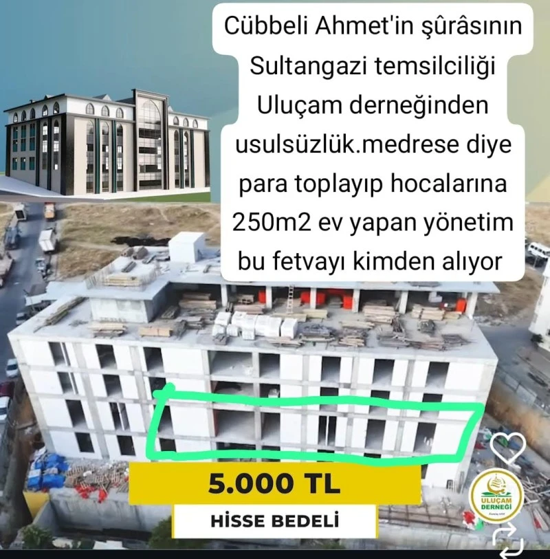 Ancak Uluçam Derneği’nin külliye inşaatı için topladığı ümmetin paraları, Cübbeli’nin Vekili Hasan Hüseyin Aydınlık ve yandaşlarının lüksüne (ev ve araba) gidiyordu.