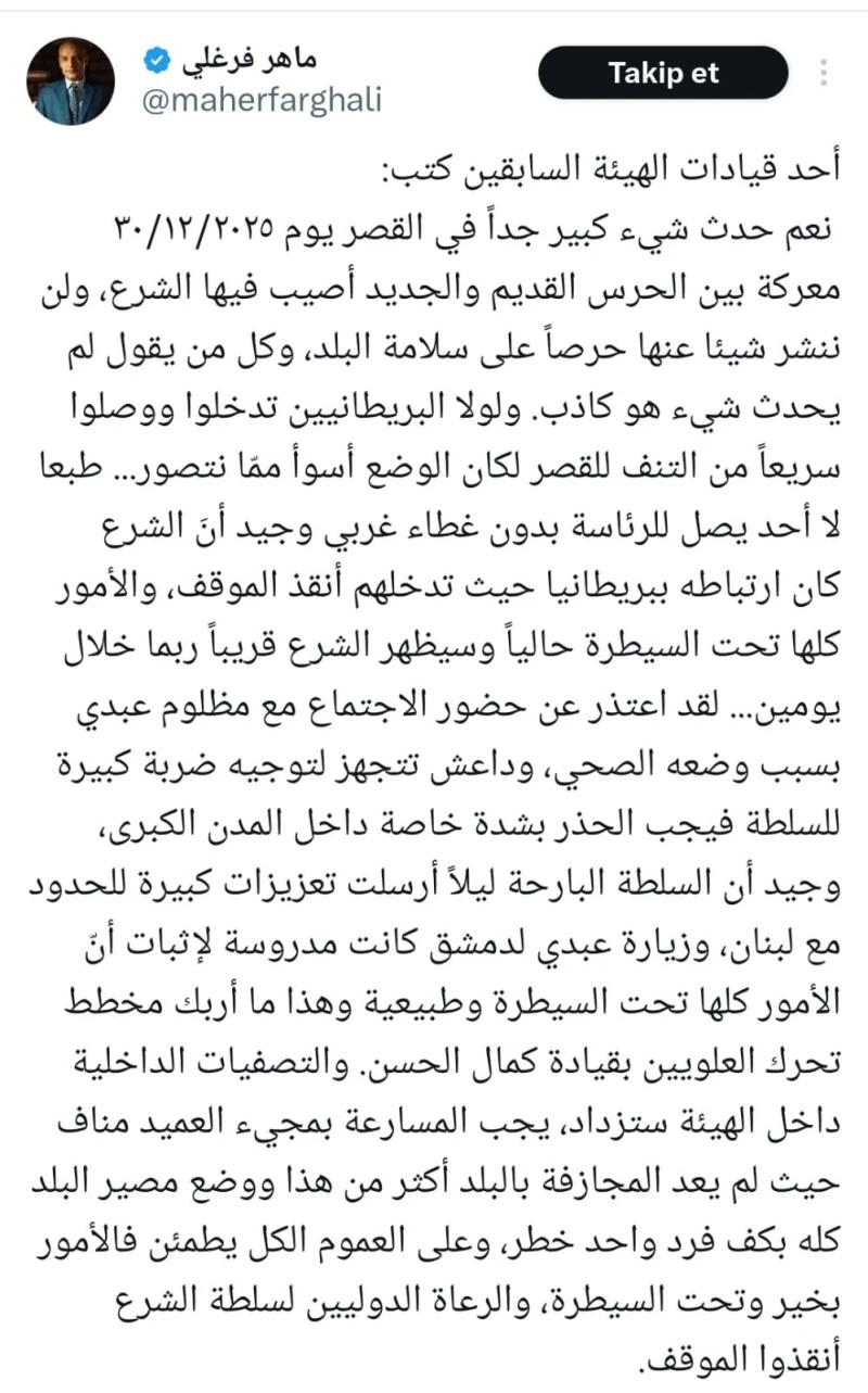 Mısırlı araştırmacı Maher Farghali’nin, Heyet Tahrir el-Şam’ın (HTŞ) eski yöneticilerinden birini kaynak göstererek sosyal medya hesabından paylaştığı bilgiye göre, 30 Aralık 2025 günü Şam’daki Başkanlık Sarayı’nda çok büyük bir olay yaşandı. İddiaya göre, eski muhafızlar ile yeni muhafızlar arasında bir çatışma çıktı ve bu çatışmada Şara yaralandı.