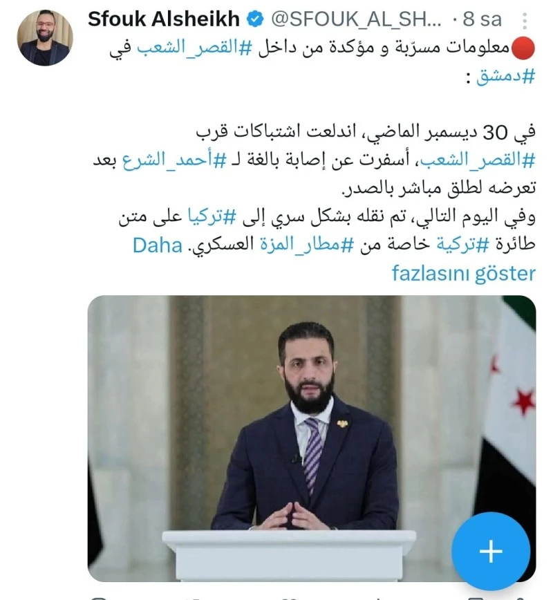 Bu bilgi, başka kaynaklarda da yer buldu. Sfouk Alsheikh isimli hesaptan da benzer bilgiler paylaşıldı. Şam’daki Halk Sarayı’ndan sızdırılan ve doğrulanan bilgilere göre, 30 Aralık’ta Halk Sarayı yakınlarında çatışmalar çıktı ve Ahmed el-Şara göğsünden vurularak ağır yaralandı. İddiaya göre, ertesi gün Mezzeh Askerî Havaalanı’ndan özel bir Türk uçağıyla gizlice Türkiye’ye götürüldü. Şu ana kadar Şam hükümeti, yaşananlar konusunda sıkı bir gizlilik içinde olup, kamuoyunda kafa karışıklığı ve belirsizlik hâkim.